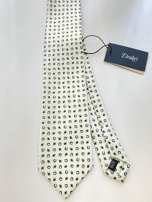 Drakes Handmade Tipped Silk Tie With Tag Horseshoe and Four-leaf clover