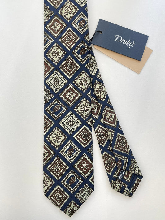 Drakes Motor Motif Navy Silk Tie Handmade Tie Limited Edition